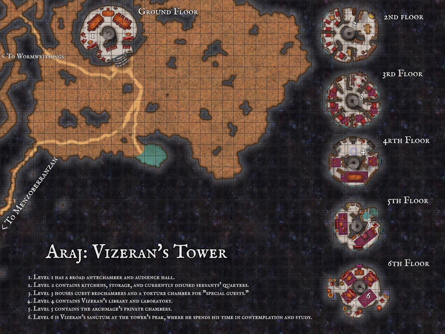 (Folsen the 4th of Misuthar) The group woke early and set off, with travel through the dark worm withings being uneventful, just a lot of dark, dry, 10 feet round worm tunnels running in weird random patterns, as the party made its way to Araj Tower. When they were getting close to the location of the secret tunnel leading to the tower, it was starting to get close to the time where the party usually camped for a long rest. So they once again set up the ‘tiny huts’ and had a long rest in the darkness safe from random encounters.